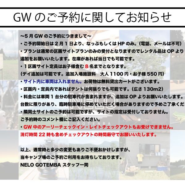 3年目を迎えて 2022.03.24 NELO まだまだ寒い日が続きますが皆様のおかげにより、当キャンプ場も3度目の春を迎えることができました。 ありがとうございます。 2年共にした、大事な看板もかなり疲弊したため、新しく作り直しました。 今後も少しづつですが、お客様に快適に過ごしていただくために努めますので、 今後ともNELOGOTEMBAをよろしくお願いいたします。 NELOGOTEMBA スタッフ HOME ・ 3年目を迎えて NEWS一覧 NELOの記事一覧 新着記事 2023.02.07 NELO 2023年GWのご予約につきましてのご案内 2022.10.25 NELO さつまいもの販売を開始しました。 2022.03.28 NELO 自動販売機の設置
